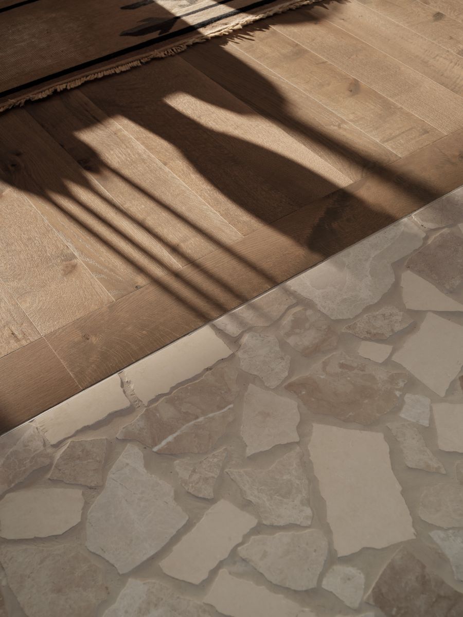 Textures abound; from the sweeping mosaic entry that bridges indoors and out, to softly plastered walls, to the rhythm of exposed rafter tails overhead. These tactile layers set the stage for our Jeffrey Dungan Architectural Collection, Opelika No.65. The plank’s taupe tones and linear grain create a beautiful juxtaposition to the natural heritage of Northern Appalachian White Oak.